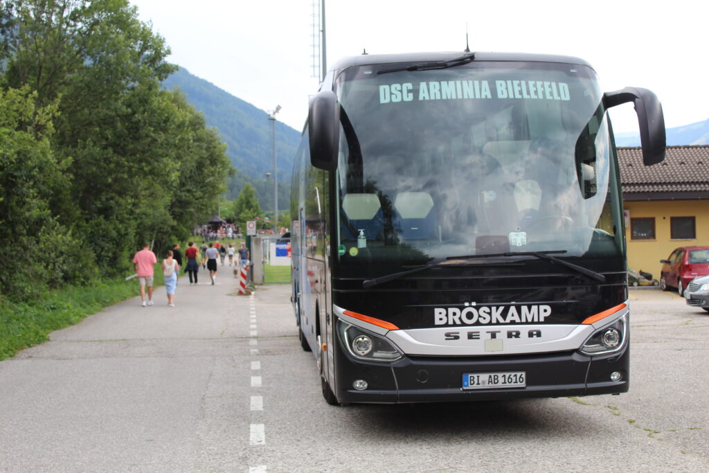 Der Mannschaftsbus der Arminia Bielefeld auf dem Sportplatz von St. Sigmund – Foto: UT24/hz