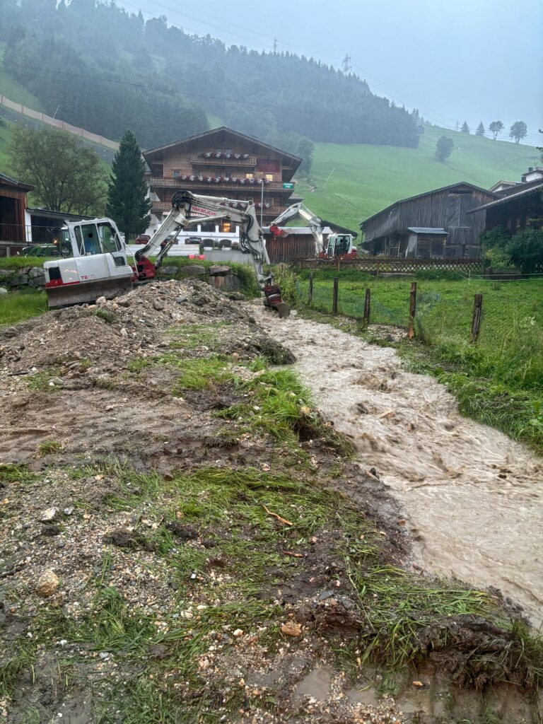 Am Nachmittag wurde die Freiwillige Feuerwehr Gerlos zum ersten Mal alarmiert, nachdem der Mitterhofbach im Ortszentrum aufgrund des vielen Regens über die Ufer trat und sich seinen Weg über die Gerlosstraße bahnte. Als der Niederschlag etwas nachließ, begannen die Wehrleute mit den Reinigungsarbeiten.