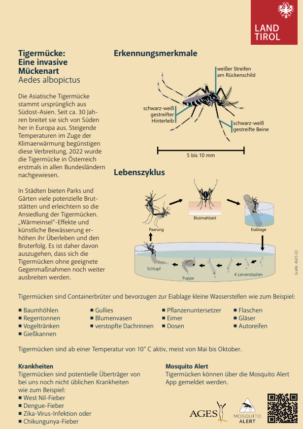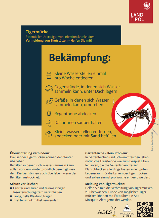 Um die Verbreitung der Asiatischen Tigermücke in Tirol einzudämmen, wurde daher erst kürzlich allen Tiroler Gemeinden seitens des Landes Informationsmaterial zur Verfügung gestellt. In bewohnten Gebieten bieten beispielsweise Parks und Gärten viele potenzielle Brutstätten und erleichtern so die Ansiedlung der Tigermücken. „Städtische ‚Wärmeinsel-Effekte‘ und künstliche Bewässerung erhöhen das Überleben und den Bruterfolg der Tigermücke. Daher ist es wichtig, die Menschen zu sensibilisieren, um Brutstätten zu vermeiden und damit die Verbreitung der Tigermücke in Tirol einzudämmen“, betont Gesundheitsdirektorin Geley.