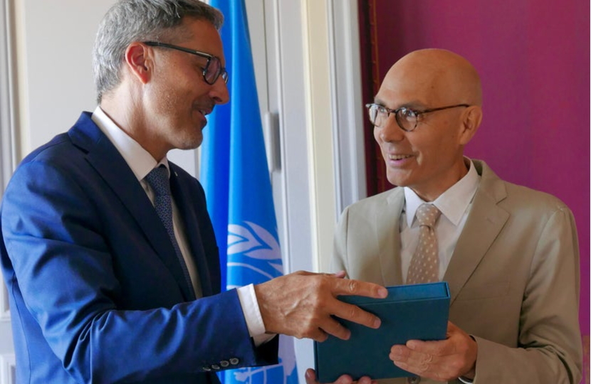 Landeshauptmann Arno Kompatscher (von links) und UN-Hochkommissar für Menschenrechte, Volker Türk, sprachen heute (12. August) in Genf über eine mögliche Zusammenarbeit mit den Vereinten Nationen für das geplante Kompetenzzentrum für Minderheiten und Autonomie in Bozen. - Foto: LPA