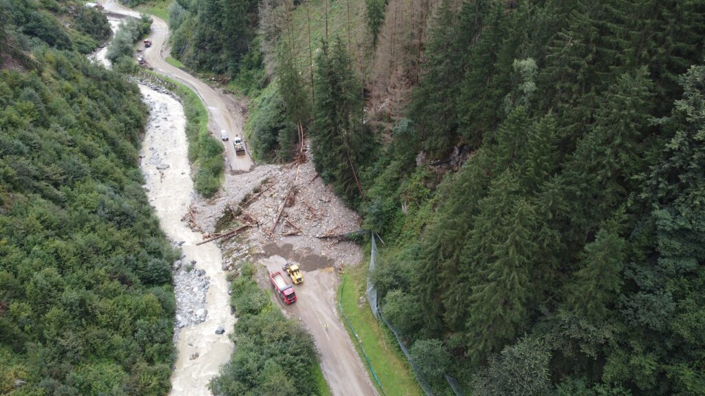 Auch die L13 Sellraintalstraße im Gemeindegebiet von Sellrain zwischen Sellrain und Kematen bleibt nach einem Murenabgang weiterhin gesperrt. – Foto: © Land Tirol