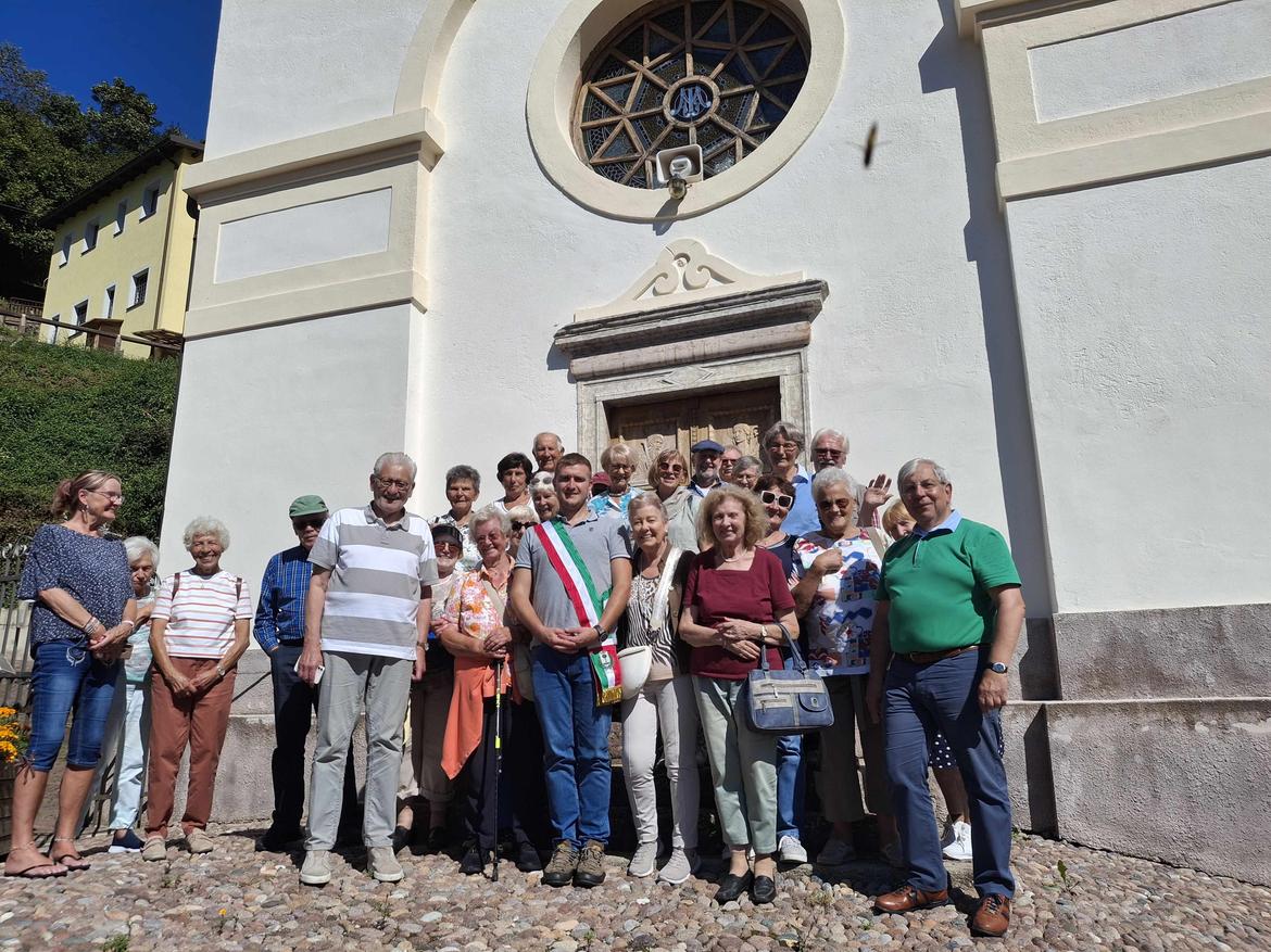 Il gruppo da Augsburg in visita alla chiesa di Roveda con il sindaco di Frassilongo Luca Puecher [Foto BKI / Ufficio Stampa PAT]