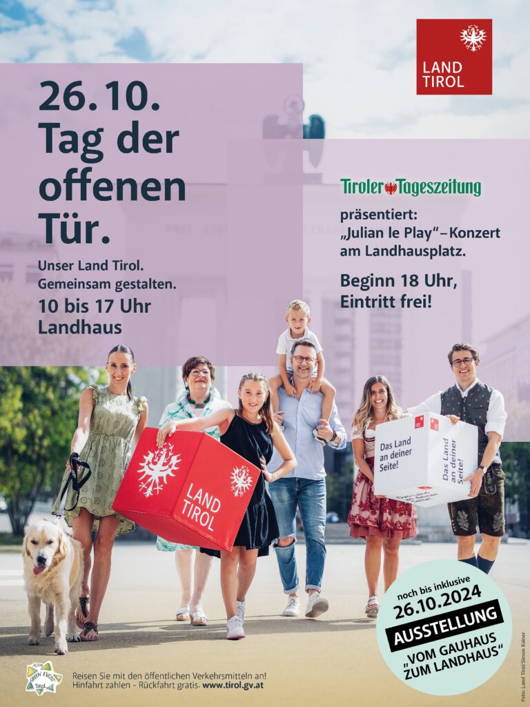 „Ich freue mich auf den Tag der offenen Tür. Wir öffnen die Türen des Landhauses und geben einen Blick hinter die Kulissen. Bürger können sich abseits vom Tagesgeschäft im Landhaus über das vielfältige Angebot und die Tätigkeitsbereiche des Landes informieren. Für mich ist es ein ganz besonderer Tag, an dem ich mit besonders vielen Menschen aus allen Bezirken ins Gespräch komme. Ich lade deshalb alle Tiroler ein, am 26. Oktober das Innsbrucker Landhaus zu besuchen“, erklärt LH Anton Mattle.