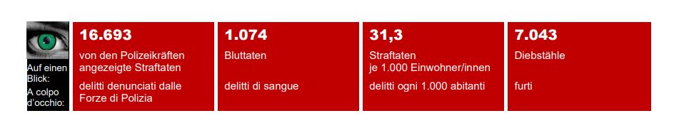 Das Landesinstitut für Statistik (ASTAT) teilt mit, dass im Jahr 2023 in Südtirol 16.693 Straftaten von den Polizeikräften bei der Gerichtsbehörde angezeigt (+2,7 % gegenüber dem Vorjahr) und 7.198 Tatverdächtige gemeldet wurden. Es gab eine Abnahme der Diebstähle (-6,8 %) und eine Zunahme der sogenannten „Bluttaten“ (+28,0 %).