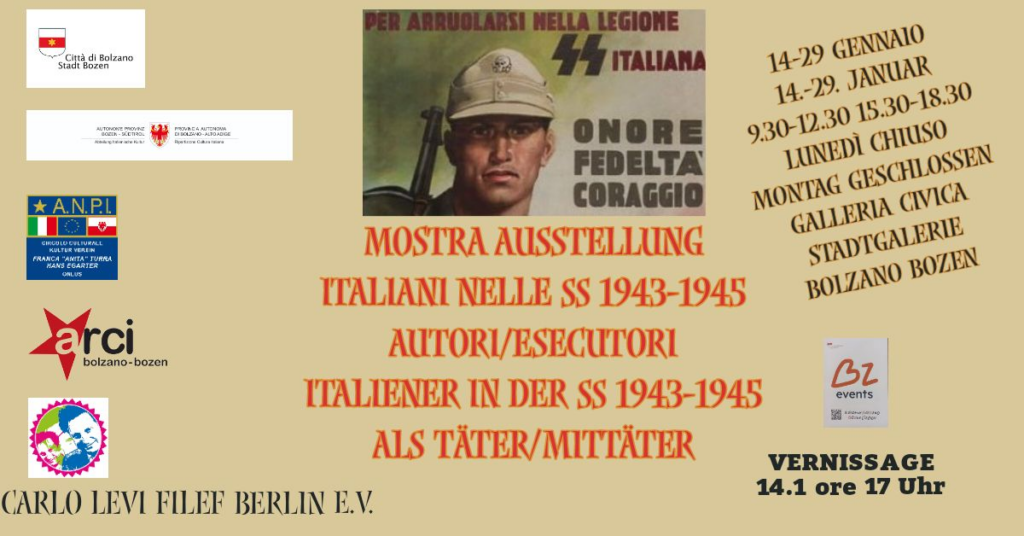 L’iniziativa è promossa da Circolo Culturale ANPI Franca „Anita“ Turra Hans Egarter in collaborazione con il Circolo Carlo Levi/FILEF di Berlino, ARCI Bolzano Bozen con il sostegno dell’Assessorato alla Cultura del Comune di Bolzano e dell’Assessorato alla Cultura in lingua italiana della Provincia di Bolzano nell’ambito delle iniziative per il giorno della Memoria 2025.