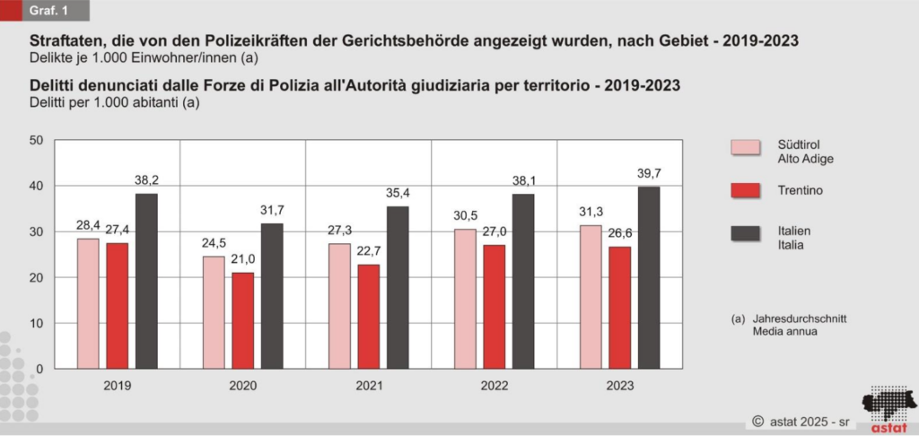 Im vergangenen Jahr wurden insgesamt 16.693 Straftaten bei der Gerichtsbehörde angezeigt. Das entspricht einem Anstieg von 2,7 Prozent im Vergleich zu 2022 (16.258 Straftaten). Die Kriminalitätsrate beträgt in Südtirol nun 31,3 Straftaten pro 1.000 Einwohner, während sie in Italien auf 39,7 und im Welschtirol auf 26,6 angestiegen bzw. gesunken ist.