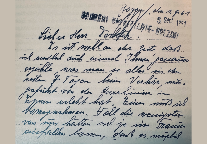 Es ist wohl an der Zeit, daß ich endlich auch einmal Ihnen genau erzähle, was man so alles in den ersten 7 Tagen beim Verhör, ausgeführt von den Carabinieri in Eppan erlebt hat. Eines muß ich vorwegnehmen. Wohl die wenigsten von uns hätten sich je im Traum einfallen lassen, daß es möglich wäre, daß die verhörenden Organe mit uns in so brutaler und in vielen Fällen offensichtlich so gehässiger Form umgehen würden. Möchte Ihnen somit, so gut ich eben noch alles in Erinnerung habe, ein Bild von den unvergesslichen Erlebnissen machen, von dem, was ich an mir selbst erlebt habe, und was ich bei anderen Landsleuten mit ansehen mußte.