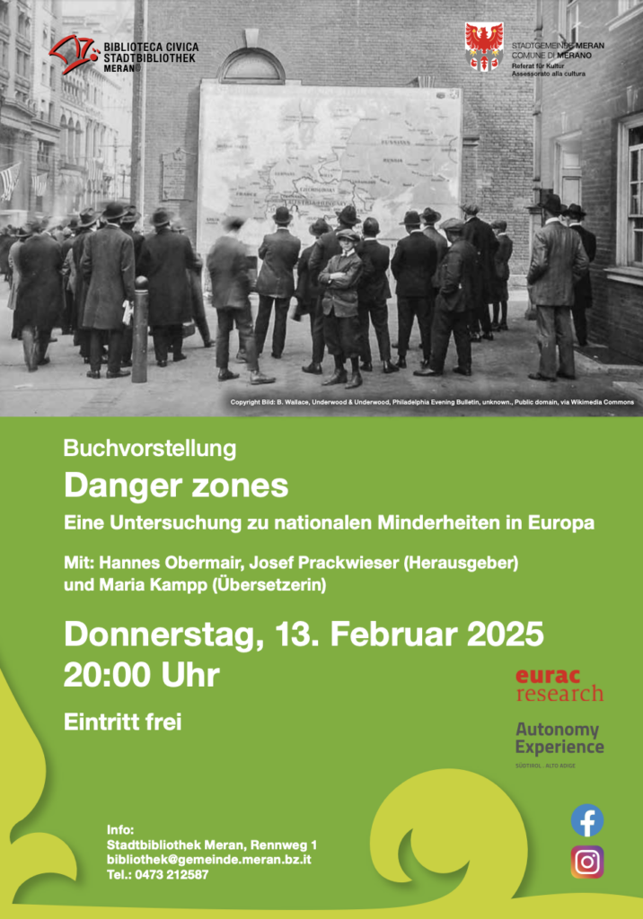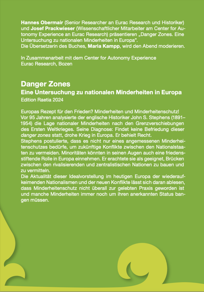 „Danger Zones – Eine Untersuchung zu nationalen Minderheiten in Europa“ stammt von Hannes Obermair, einem Südtiroler Historiker und Senior Researcher an Eurac Research, und Josef Prackwieser, wissenschaftlicher Mitarbeiter am Center for Autonomy Experience. Das Buch erschien 2024 bei Edition Raetia und wurde von Maria Kampp übersetzt. Sie wird auch die Moderation der Veranstaltung übernehmen.