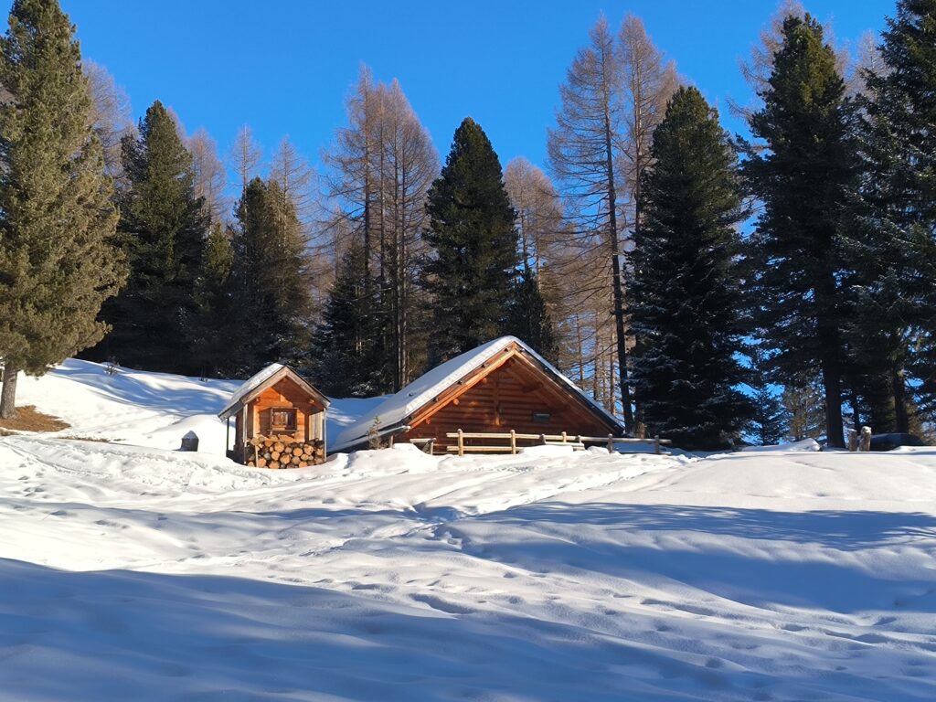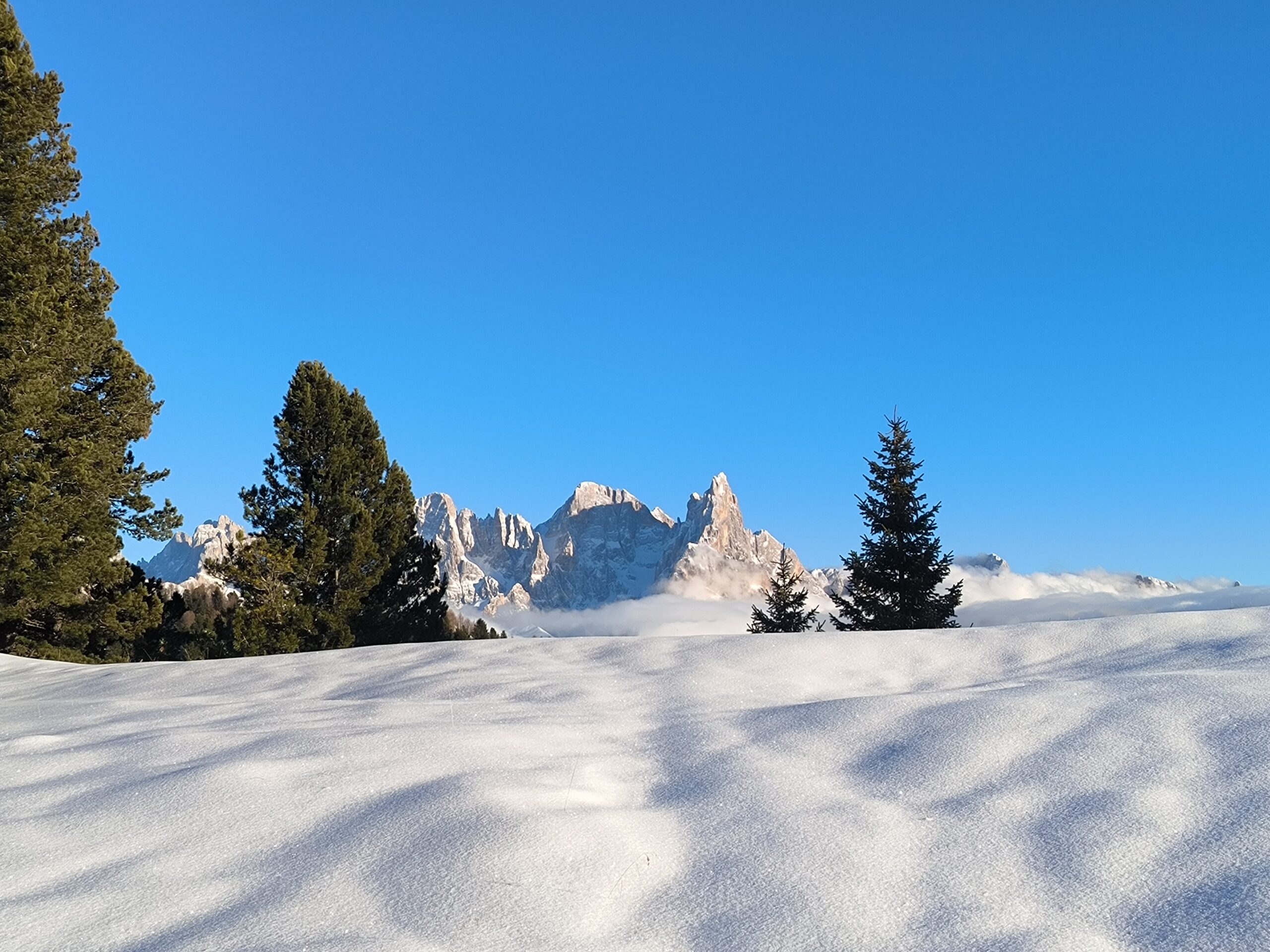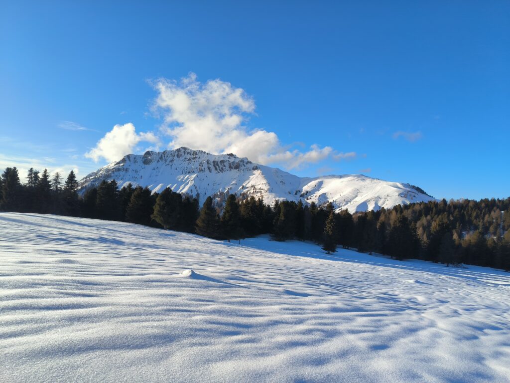 Presto la confusione delle piste lascia spazio al silenzio della natura; il luogo è incantato,  dominato dalle Pale di San Martino, cima Viezzena e la lunga Catena del Lagorai.