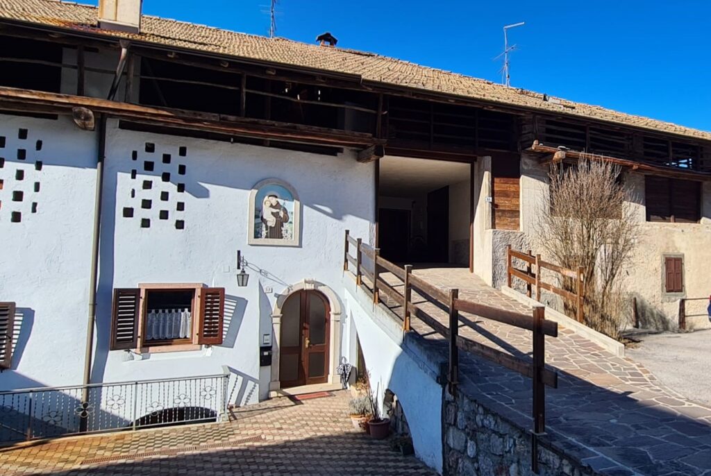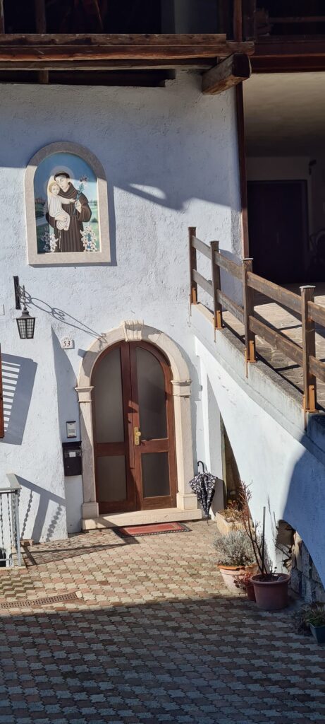 Attraversando il paese di Poia, abbiamo notato un’antica casa che, nonostante la recente ristrutturazione, è riuscita a conservare tutte le caratteristiche dell’architettura tradizionale del Lomaso: il „pont“ che conduceva alla „era“, il fienile; i graticci in legno dove appendere le spighe di granturco; le finestre piccole a tenere fuori il freddo ed portali in pietra lavorata. E non poteva mancare, sulla parete dell’edificio, in parte adibito ad abitazione ma in parte di uso agricolo, la raffigurazione di Sant’Antonio.