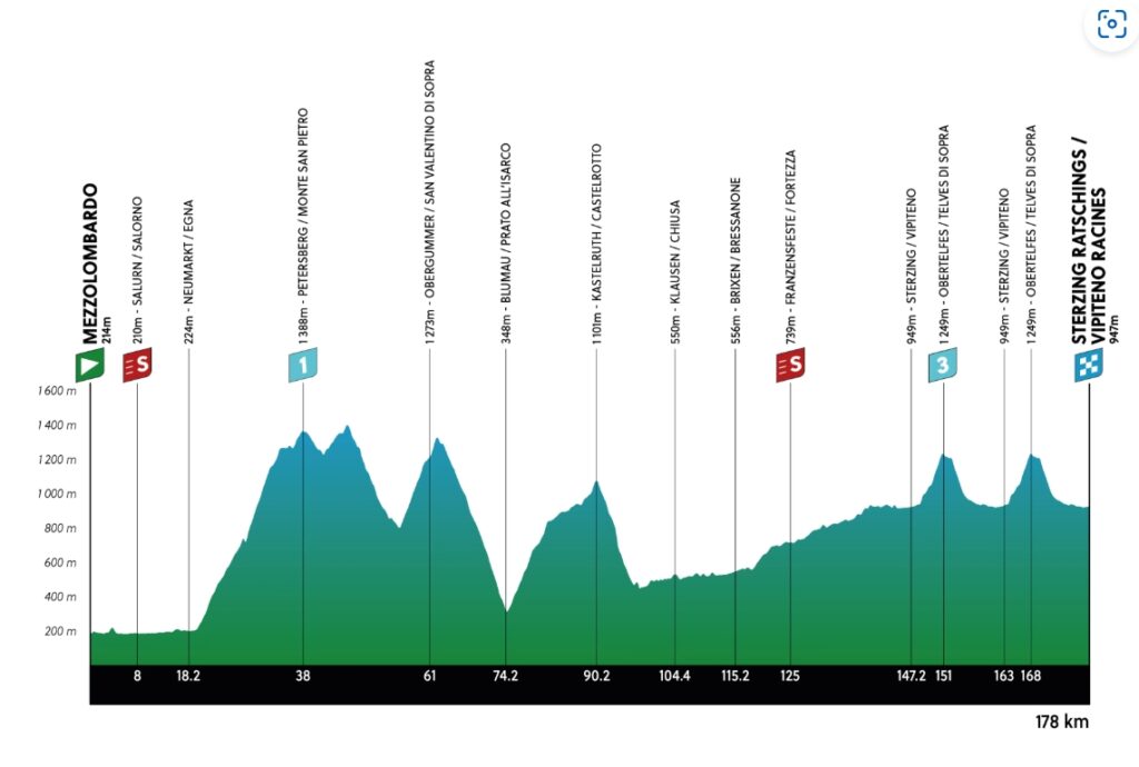 La seconda tappa dell’Euregio Tour of the Alps 2025, da Mezzolombardo a Sterzing – Ratschings, risulta essere quella con maggior chilometraggio (178 Km) e dislivello (3750 metri). Dopo la partenza da Mezzolombardo e un inizio pianeggiante, il GPM di Petersberg e un successivo tratto di salite e discese in rapida successione son destinati a far accumulare fatica ai corridori in vista della parte decisiva della tappa.