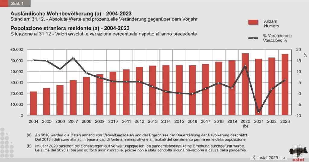 Zum Stichtag 31. Dezember 2023 zählte Südtirol 55.913 ausländische Staatsangehörige. Das entspricht 10,4 Prozent der Gesamtbevölkerung. Innerhalb eines Jahres ist diese Zahl um 3.266 Personen gestiegen – ein Plus von 6,2 Prozent. Damit hat sich die Zahl der ausländischen Wohnbevölkerung seit 2003 verdreifacht.