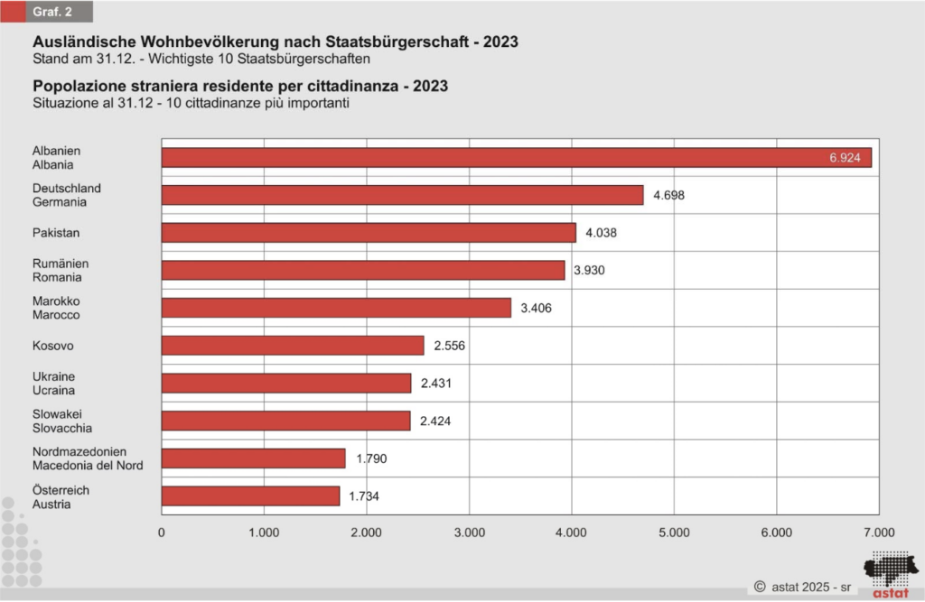 Ende 2023 lebten Menschen aus 150 Nationen in Südtirol. Die größte Gruppe stellt Albanien mit 6.924 Personen. Es folgen: