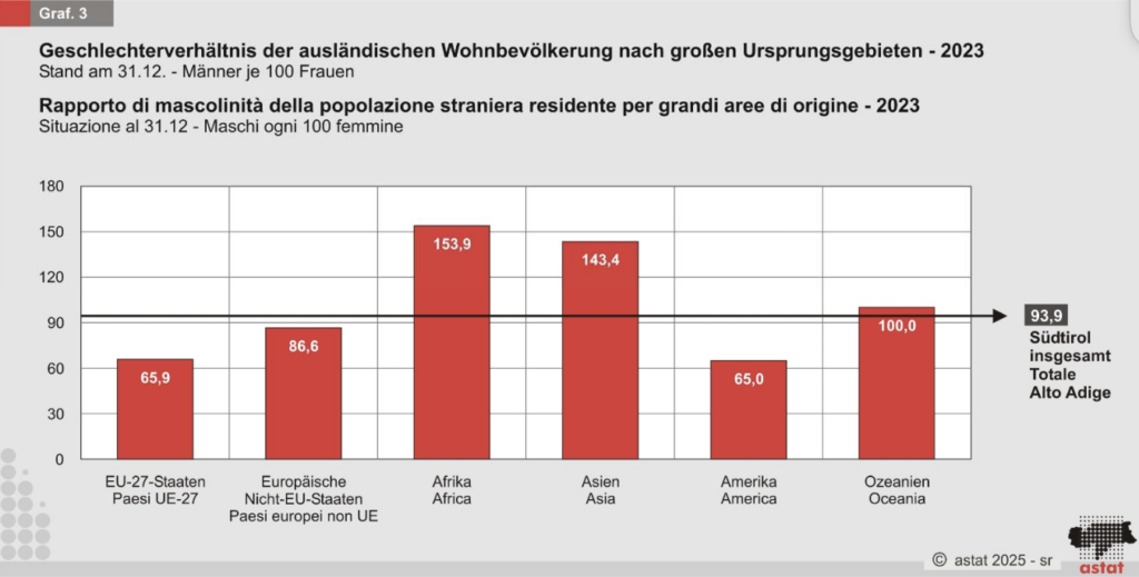 2023 wanderten 7.524 Personen mit ausländischer Staatsangehörigkeit nach Südtirol ein, mehr als die Hälfte davon direkt aus dem Ausland (55,7 Prozent). 3.680 verließen das Land, vorwiegend in andere Provinzen. Daraus ergibt sich ein positiver Wanderungssaldo von 3.844 Personen – davon 3.238 durch Zuzug aus dem Ausland.