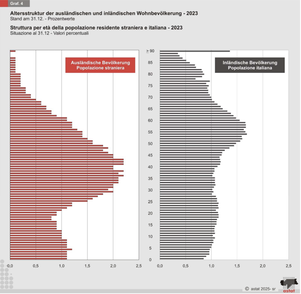 Das Durchschnittsalter der ausländischen Bevölkerung liegt bei 37,2 Jahren, jenes der inländischen bei 44,5 Jahren. Nur 6,8 Prozent der Ausländer sind über 64 Jahre alt.