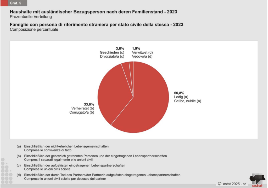 Südtirol zählt 21.785 Haushalte mit Ausländern. 60,8 Prozent sind ledig, 33,6 Prozent verheiratet oder in Partnerschaft.