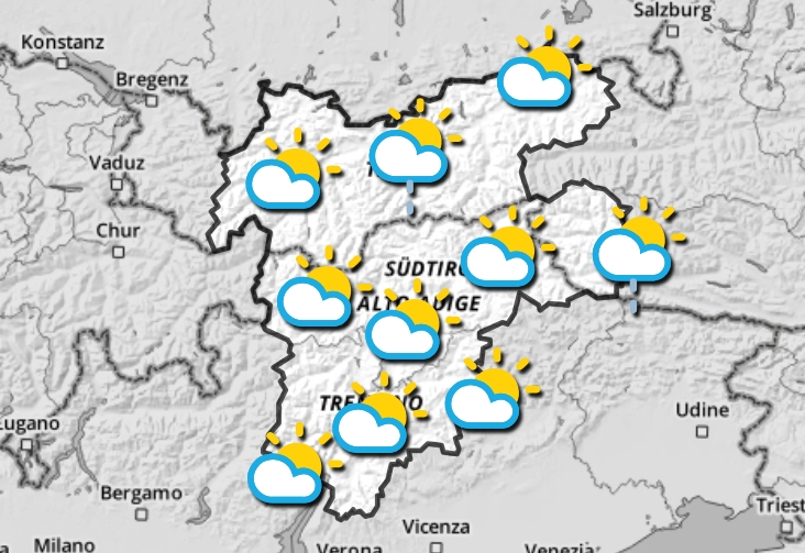Temperature previste: Innsbruck 11° / 21°; Bolzano 13° / 24°; Trento 13° / 23°