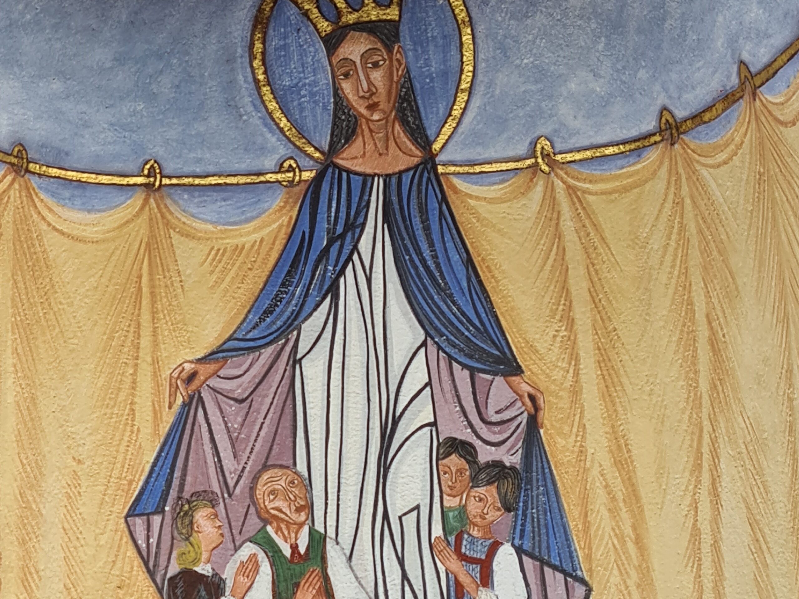 Sotto il suo mantello, allargato fino ad avvolgerle, ci sono quattro figure: uomini e donne, giovani e anziane, tutte indossano l‚abito tradizionale tirolese. La scritta che completa l’immagine sacra racconta di preghiera, di speranza, di fede: „Maria, allarga il Tuo manto, per noi fanne protezione e riparo“…Â