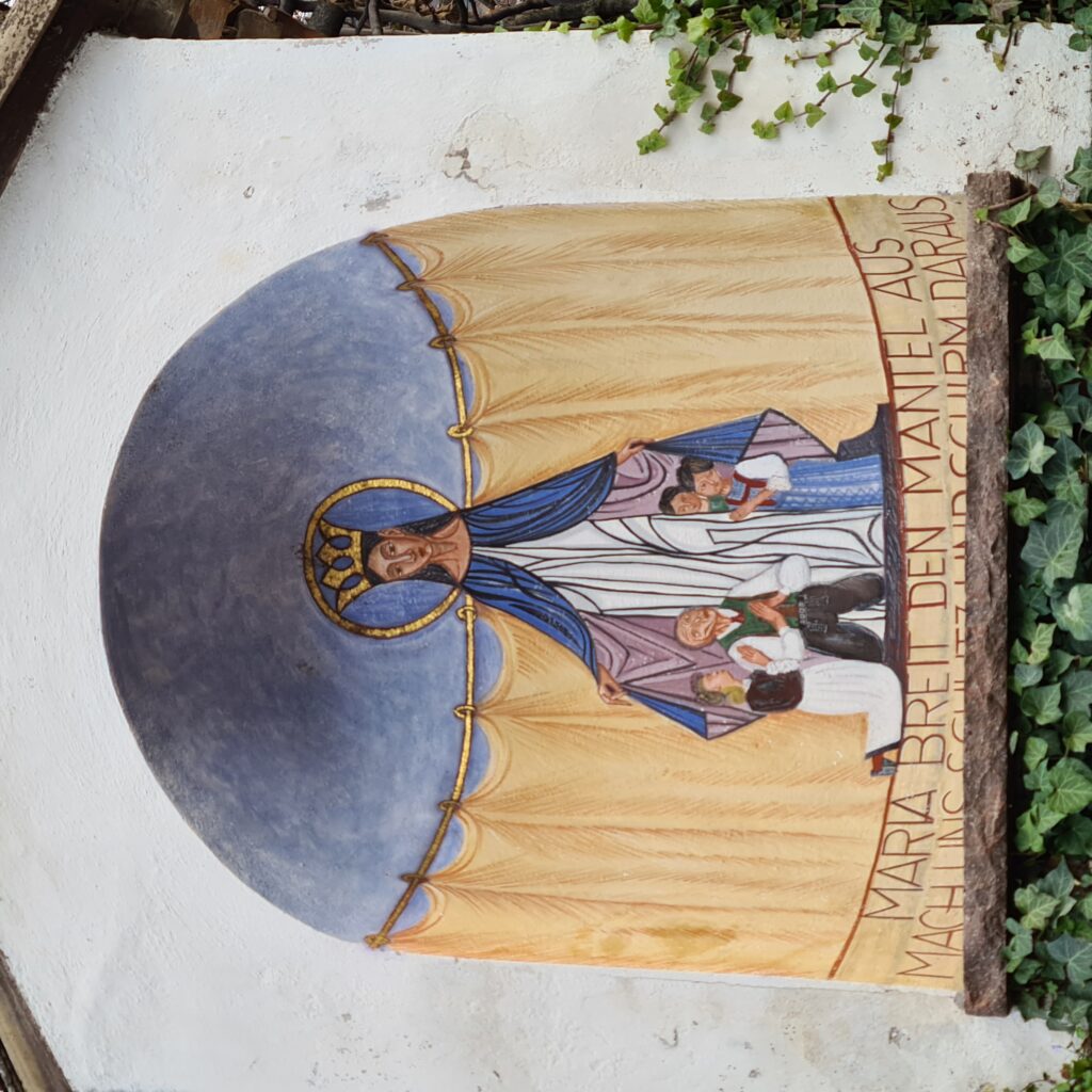 Sotto il suo mantello, allargato fino ad avvolgerle, ci sono quattro figure: uomini e donne, giovani e anziane, tutte indossano l‚abito tradizionale tirolese. La scritta che completa l’immagine sacra racconta di preghiera, di speranza, di fede: „Maria, allarga il Tuo manto, per noi fanne protezione e riparo“…Â