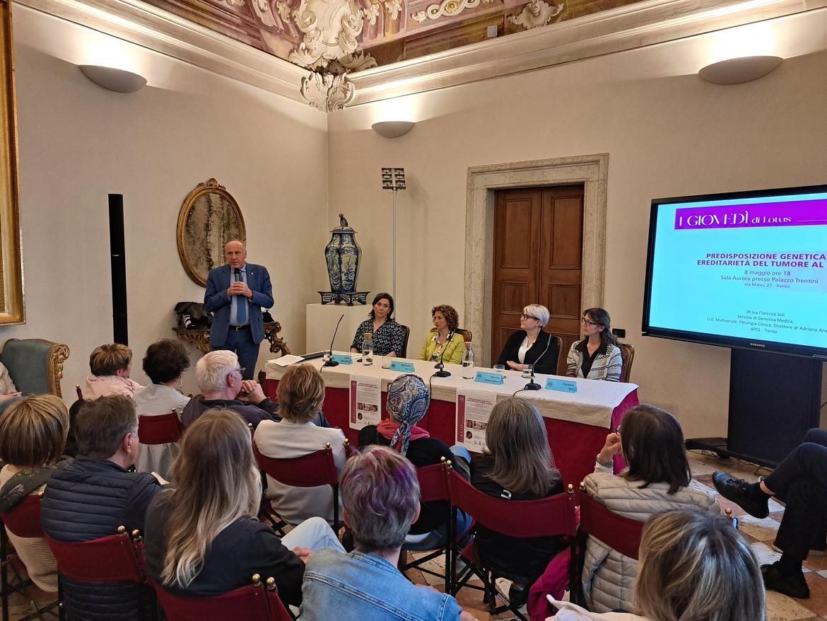 Ecco perché il sistema trentino si è da tempo attivato per favorire tali prestazioni. In caso di positività in un paziente, viene data la possibilità anche ai familiari sani di effettuare il test e, se questo risulta positivo, di poter accedere ad un programma di sorveglianza ravvicinato ma anche ad una strategia chirurgica di riduzione del rischio. Questo il tema al centro dell’incontro, per i Giovedì dell’associazione Lotus, a Palazzo Trentini, dedicato proprio alla “predisposizione genetica ed ereditarietà del cancro al seno”, alla presenza dell’assessore provinciale alla salute Mario Tonina.