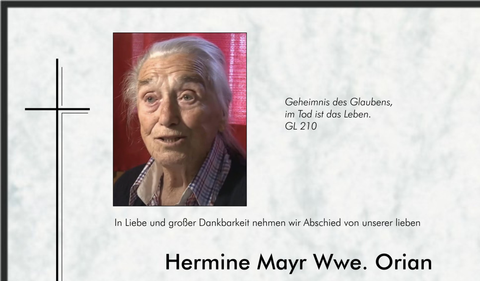 Le esequie di Hermine Orian si terranno domani, sabato 17 maggio alle ore 14.30 nella chiesa parrocchiale di Schenna; il corteo funebre partirà dalla Martinskapelle. Questa sera alle 19.30, sempre nella parrocchiale, ci sarà il Santo Rosario