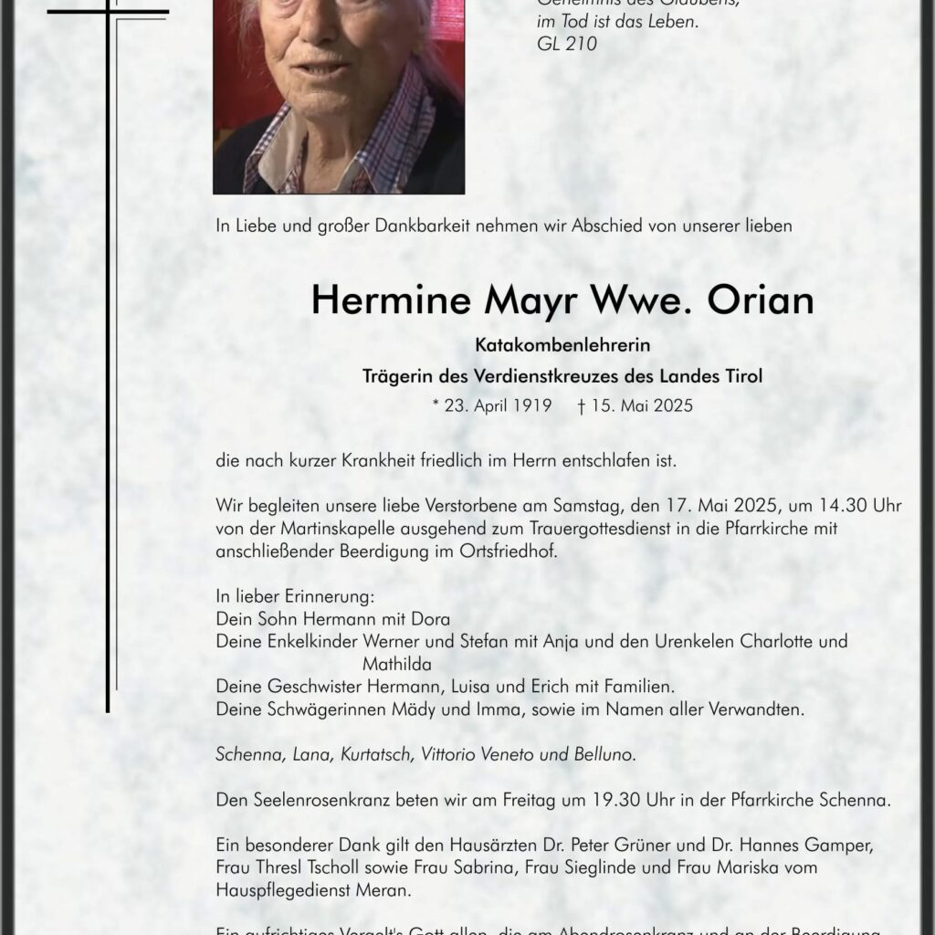 Le esequie di Hermine Orian si terranno domani, sabato 17 maggio alle ore 14.30 nella chiesa parrocchiale di Schenna; il corteo funebre partirà dalla Martinskapelle. Questa sera alle 19.30, sempre nella parrocchiale, ci sarà il Santo Rosario