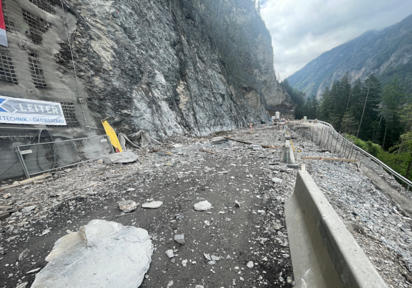 Auf der B 180 Reschenstraße im Bereich der Baustelle der Kanzelgalerie kam zu einem größeren Blocksturz im Zuge der Felsberäumung. (© Land Tirol)