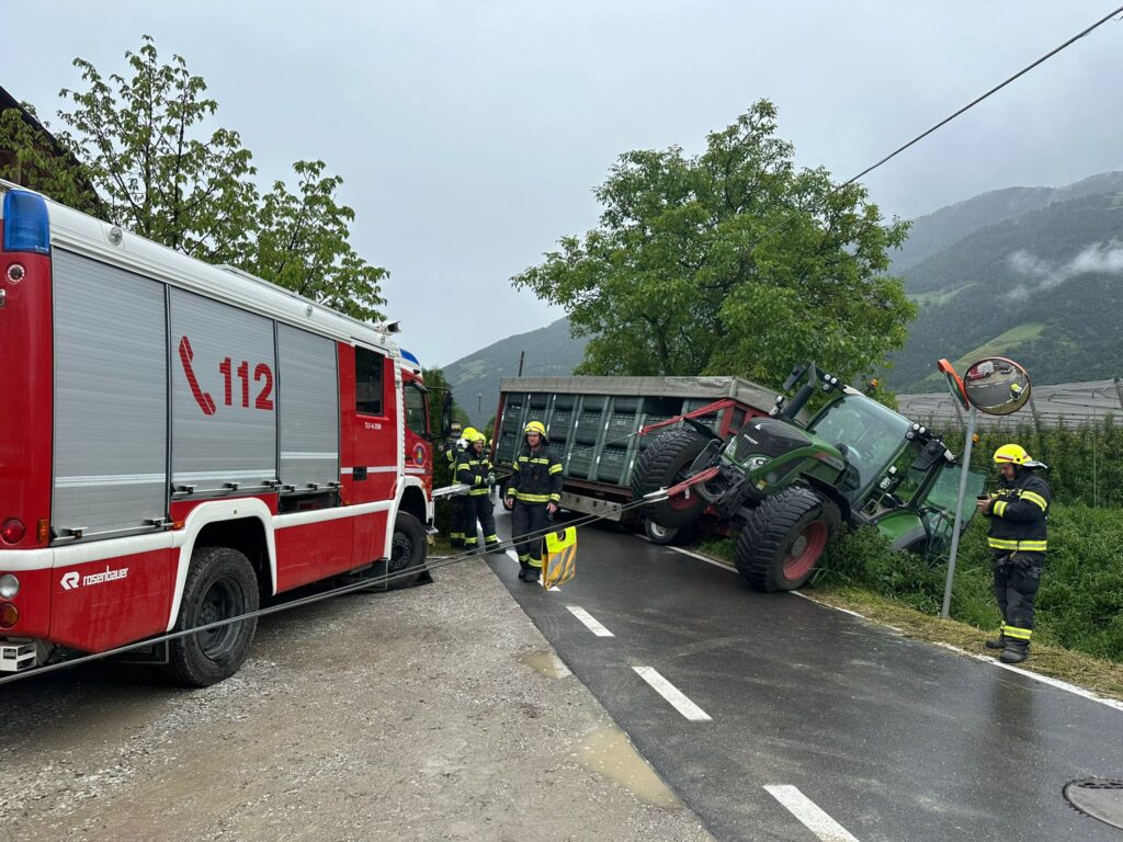 Der Unfall ereignete sich gegen 8.50 Uhr im Sägeweg. Die Freiwilligen Feuerwehren von Plaus und Naturns wurden gemeinsam mit der Berufsfeuerwehr Bozen, dem Weißen Kreuz und den Ordnungshüter alarmiert. Der Anhänger blockierte einen Großteil der Fahrbahn, weshalb die Straße vollständig gesperrt werden musste, berichtet die FF Plaus.