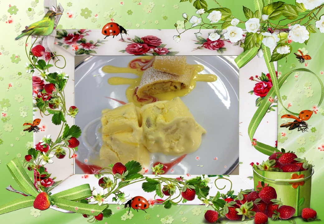 Ho preso gli asparagi bianchi di Zambana, nostrani, superfavolosi, li ho pelati, tagliati a rondelle e messi da parte. Ho impastato la farina, formato un panetto, lasciato riposare. Ho versato il latte in una casseruola, ho aggiunto metà dello zucchero, la scorza di limone e ho portato a bollore. In un’altra ciotola ho versato i tuorli e il resto dello zucchero, li ho montati con una frusta incorporando anche la farina. Ho quindi versato un po‘ di latte bollente e mescolato, unito il latte rimasto, la vanillina, eliminato la scorza di limone e mescolato velocemente, versato il tutto nella pentola e lasciato addensare sul fuoco continuando a mescolare con la frusta. Poi l’ho lasciata raffreddare in un recipiente con acqua fredda. È così che si fa una buona crema pasticcera. Ho messo un po‘ di burro in un pentolino con 30gr di zucchero semolato rosolando dolcemente, aggiunto gli asparagi caramellando e infine ho flambato con poco Calvados. Ho steso la pasta formando un rettangolo e ho riposto al centro gli asparagi, unito la crema e richiuso formando uno strudel. Ho infornato per circa 25′ a 180° pennellando di tanto in tanto con una miscela di burro e panna sciolti insieme. Per chi pensava che gli asparagi fossero da gustare solo salati, il piatto è servito, decorato con crema, succo di fragola e yogurt.