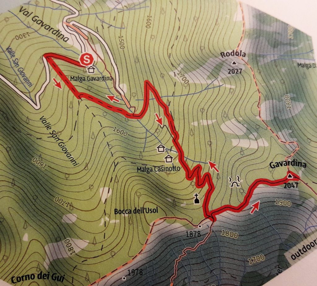 Percorso: Dal Soldatenfriedhof di Bondo, in automobile, si scende fino al ponte che attraversa la valle e si prende la strada a sinistra che sale a Malga Gavardina, fermandosi dopo circa 5 chilometri, dove si trova il parcheggio.