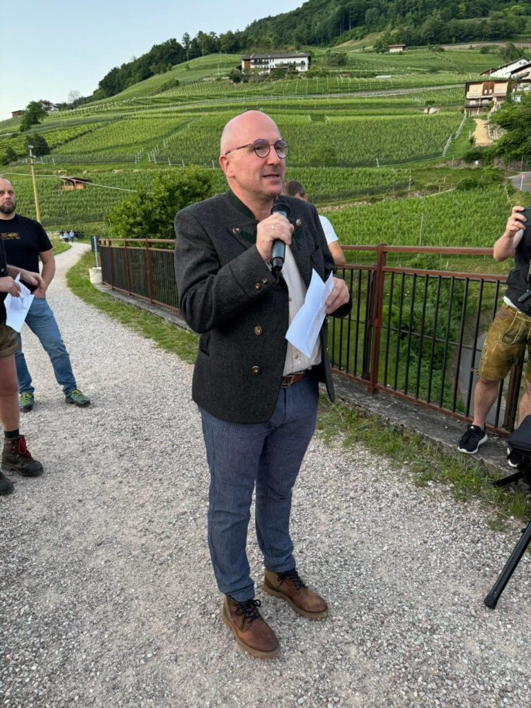 Anschließend wanderten die Anwesenden an der alten Fleimstaler Bahntrasse entlang zur Glener Brücke, wo Ehrenlandeskommandant Elmar Thaler entschiedene Worte mit Blick auf den Status Quo äußerte: „1946 und all die Jahre danach wurde immer wieder von Selbstbestimmung gesprochen. Sie wurde in Parteiprogramme geschrieben und hervorgeholt – immer dann, wenn es gerade gepasst hat. Mittlerweile ist der Begriff für viele Verantwortliche nicht nur aus der Mode gekommen – sondern zu so etwas wie einem Fremdwort geworden. Das Mittel dagegen ist ebenso simpel wie wirkungsvoll: Wir müssen uns nur jeden Tag zwei kurze Sätze verinnerlichen – und danach leben: „Die Verantwortung beginnt beim Einzelnen. Die Freiheit auch.“ Dann dreht der Wind. Und auch wenn sich die Geschichte immer wieder reimt – wir könnten diesmal den Takt selbst vorgeben. Sorgen wir dafür, dass es ein Lied der Selbstbestimmung wird.“
