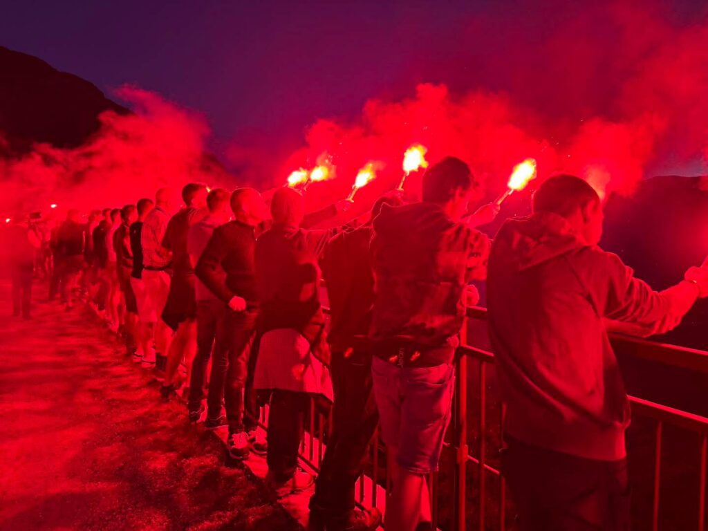 Nach dem gemeinsamen Absingen des Unterlandler Liedes wurden Bengalofeuee entzündet, die im ganzen Unterland ein markantes Zeichen setzten und die historische Erinnerung wach riefen.