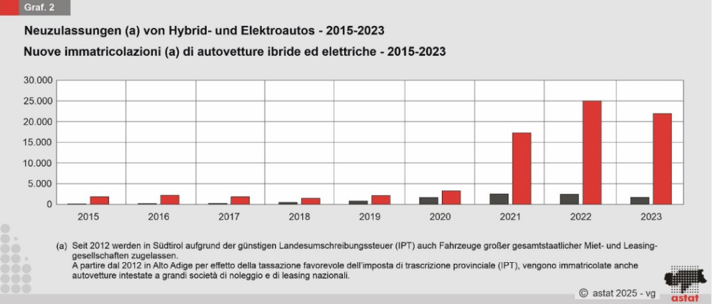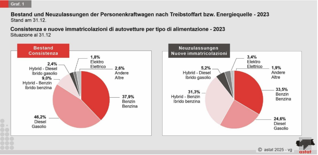 2023 wurden in Südtirol insgesamt 60.240 Autos zugelassen. Das sind 24 Prozent weniger als im Jahr zuvor. Vor allem Fahrzeuge mit Dieselantrieb (-32,9 Prozent) und Benzinantrieb (-25,1 Prozent) verzeichneten starke Rückgänge. Auch Hybridautos, die inzwischen 36,5 Prozent der Neuzulassungen ausmachten, erlebten ein Minus von 6,9 Prozent bei Benzin-Hybriden und sogar 35,6 Prozent bei Diesel-Hybriden.