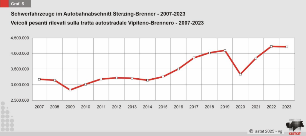 Die meistbefahrene Straße bleibt die Schnellstraße Meran-Bozen (MeBo) mit täglich rund 42.227 Fahrzeugen. Auf der Brennerautobahn wurde das höchste Verkehrsaufkommen seit zehn Jahren registriert, besonders stark zwischen S. Michele und Neumarkt/Auer.