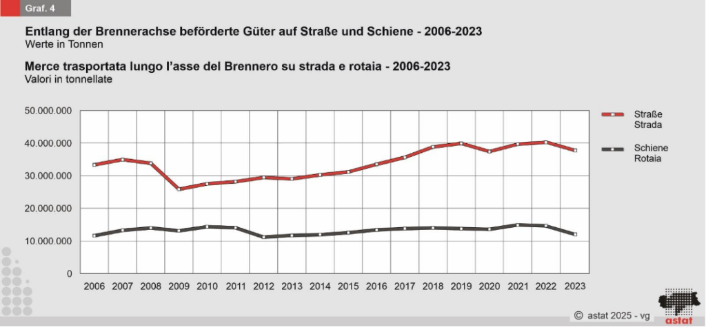 Der Güterverkehr über den Brenner ging insgesamt zurück. Dabei sanken die transportierten Güter auf der Straße um 3,6 Prozent, auf der Schiene sogar um 12,1 Prozent. Auch die Zahl der Güterzüge reduzierte sich deutlich.