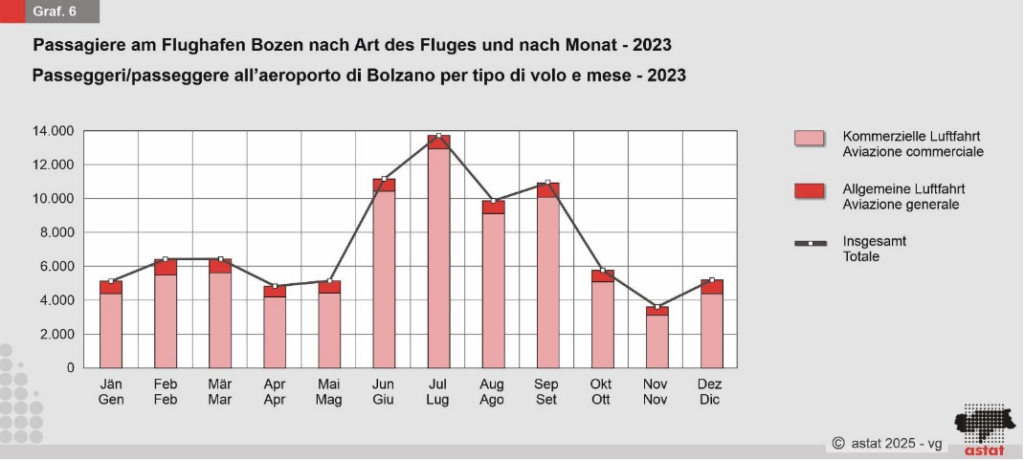 Der Flughafen Bozen verzeichnete 2023 ein Plus von 26 Prozent bei den Fluggästen. Insgesamt wurden 83.671 Passagiere abgefertigt, wobei die meisten Reisenden im Juli unterwegs waren.