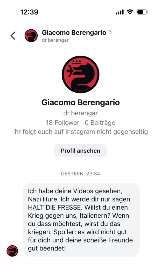Die Wortwahl ist drastisch und von offener Feindseligkeit geprägt: „Willst du einen Krieg gegen uns, Italienern? Wenn du das möchtest, wirst du das kriegen. Spoiler: es wird nicht gut für dich und deine scheiße Freunde gut beendet!“