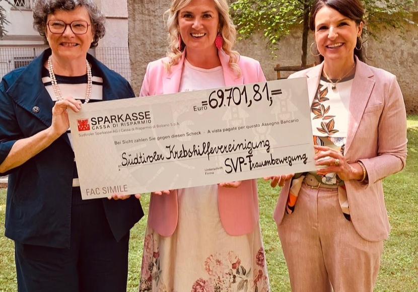 Auch Maria Claudia Bertagnolli, Präsidentin der Südtiroler Krebshilfevereinigung, zeigte sich gerührt und dankbar: Gemeinsam mit Dr.in Prader nahm sie den symbolischen Spendenscheck entgegen und lobte das Engagement der SVP-Frauen: „Ihr unermüdlicher Einsatz macht echte Hilfe für viele Betroffene möglich.“