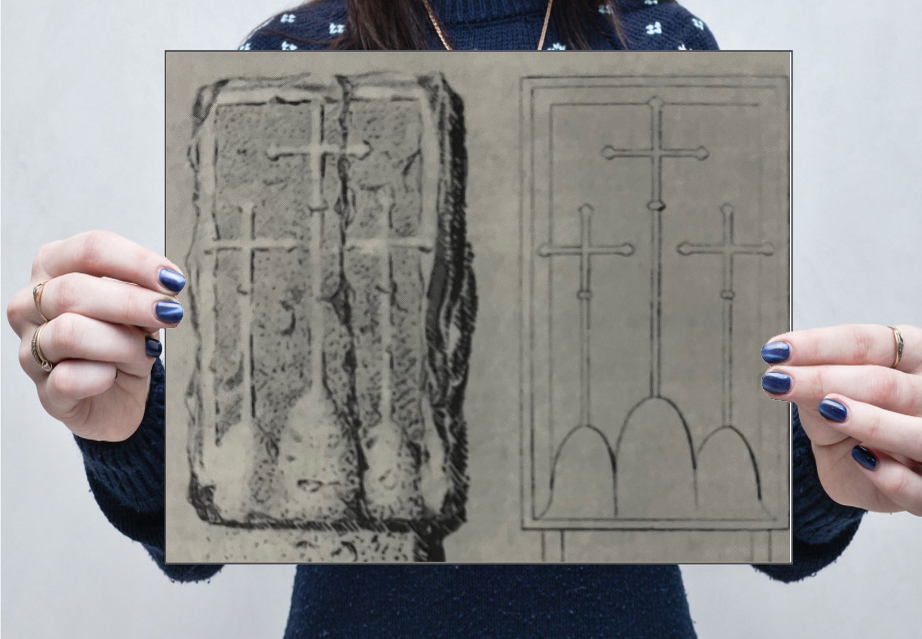 Il vecchio cippo è alto metri 2,60. I quattro bassorilievi misurano centimetri 32 per 56. Nel riquadro verso la strada è rappresentato Gesù in croce con ai lati la Vergine e s. Giovanni; verso Vezzano è raffigurato Gesù che porta la croce con sotto scolpita la lettera V (= Vezzano); sulla facciata verso Trento, che è la più deteriorata, sembra di poter individuare Cristo morto e sotto la lettera T ( = Tren- to); sul lato verso il torrente Vela si vedono tre monti sormontati da tre croci.