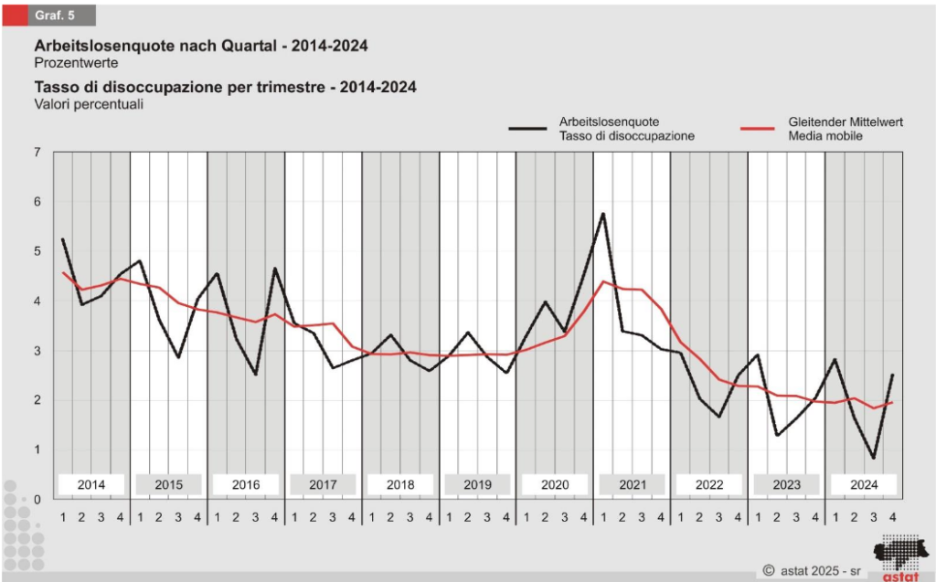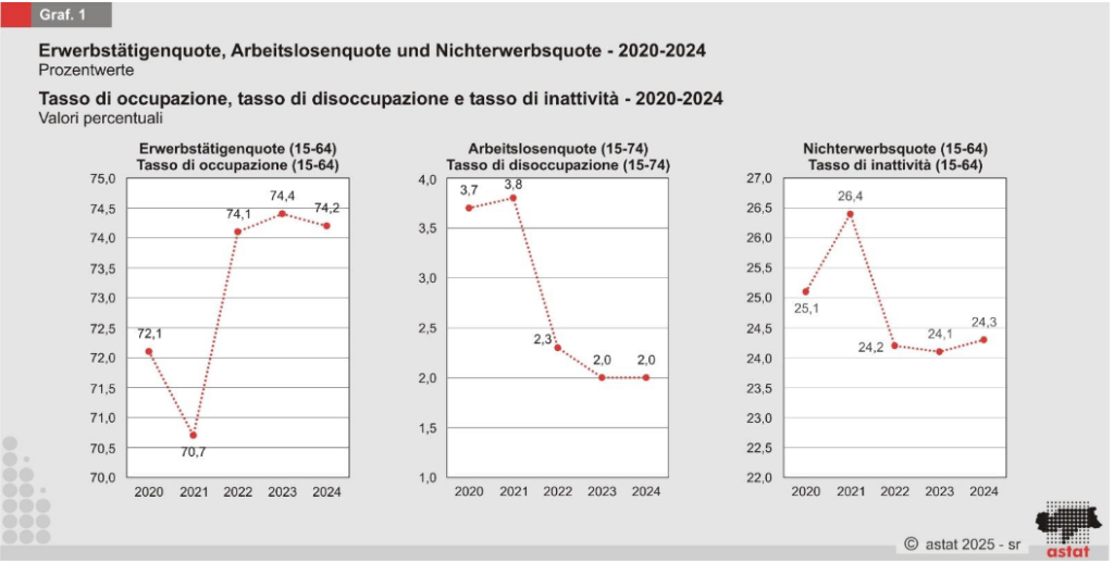 Im Jahr 2024 sind in Südtirol 260.904 Menschen erwerbstätig, 5.185 arbeitslos und 83.107 nicht erwerbstätig. Die Erwerbstätigenquote liegt bei 74,2 Prozent, die Arbeitslosenquote bei zweiProzent und die Nichterwerbsquote bei 24,3 Prozent.