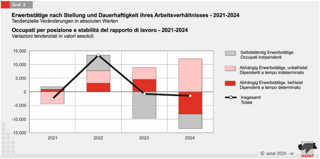 Während die Zahl der unbefristet Beschäftigten stark ansteigt (+12.066), geht jene der befristet Beschäftigten deutlich zurück (-8.130). Der Rückgang bei den Selbstständigen wird dadurch teilweise ausgeglichen, sodass die Gesamtzahl der Erwerbstätigen nahezu gleich bleibt.