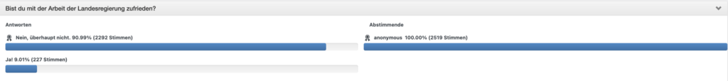 Hier das Ergebnis: 90,99 Prozent der Abstimmenden gaben an, überhaupt nicht zufrieden zu sein. Lediglich 9,01 Prozent (also 227 von insgesamt 2.519 UT24-Lesern) gaben an, dass sie mit der geleisteten Arbeit der Südtiroler Landesregierung grundsätzlich zufrieden sind. Eine bittere Ohrfeige für alle Regierungsvertreter!