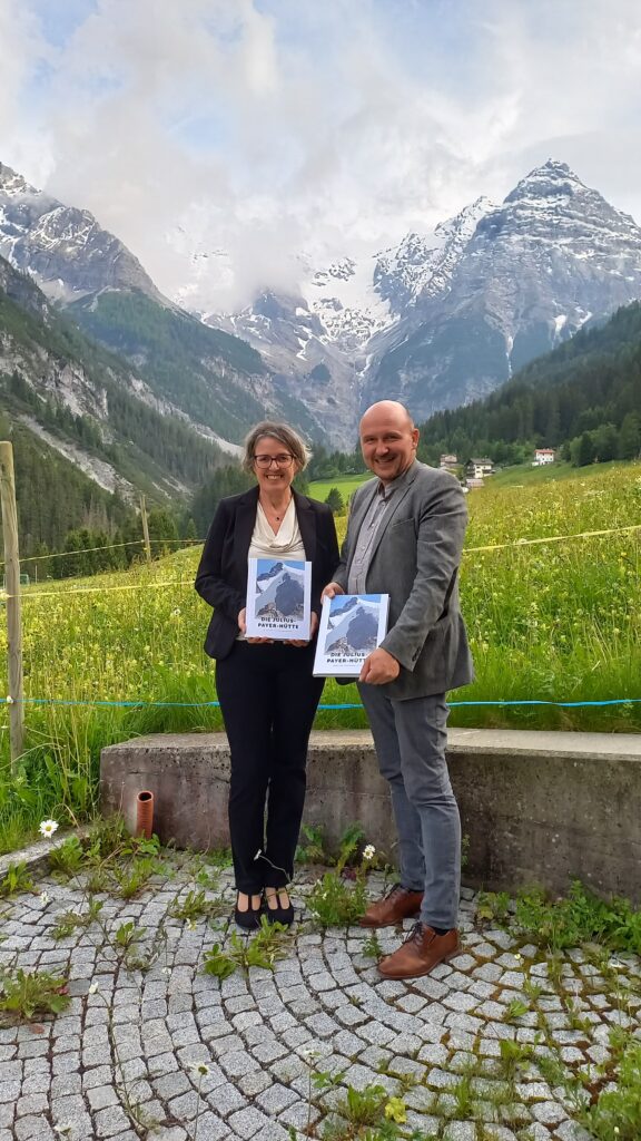 Vor imposanter Bergkulisse in Trafoi – Autorin Karin Ortler und Verleger Elmar Thaler mit dem Buch zur Julius Payer Hütter – Foto: effekt!