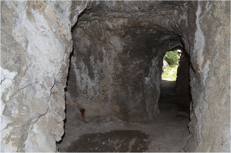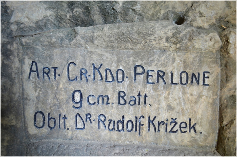 Particolare è senza dubbio lo Stützpunkt Perlone: si tratta di una lunga galleria scavata nella roccia, con due postazioni per i pezzi d’artiglieria da 90 mm, la caverna del comando con la visuale sull’intera porzione di fronte e un tratto di scala originale, uno dei gradini della quale riporta ancora l’incisione “14-15-16-17”, gli anni di guerra.