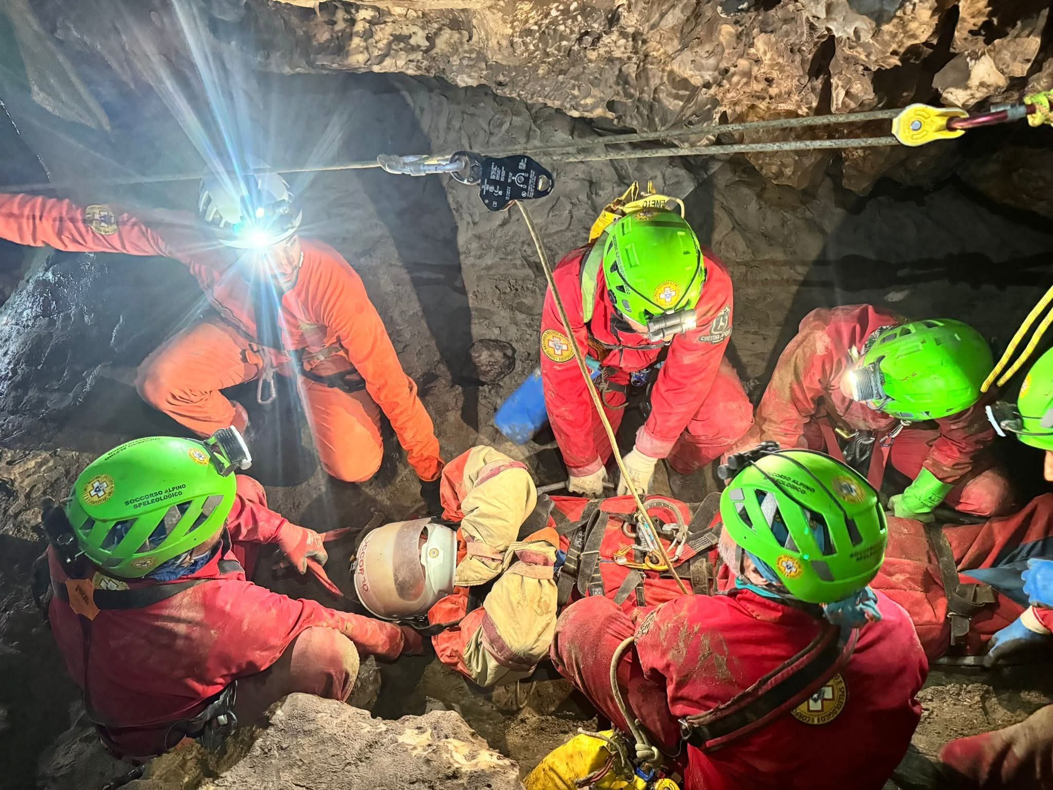 Venerdì mattina i tecnici della prima squadra sono stati elitrasportati insieme ai materiali nei pressi del campo avanzato e tre squadre di telefonisti, ognuna composta da due tecnici, sono entrate in grotta per la posa del doppino telefonico necessario alle comunicazioni tra interno ed esterno grotta, così come succede negli interventi di soccorso reali. Nel pomeriggio di venerdì altri otto tecnici hanno fatto seguito portando sul luogo dell’incidente la barella e il materiale necessario al recupero dell’infortunato. La risalita verso l’esterno della grotta è iniziata attorno alle 16.00 del venerdì pomeriggio e si è protratta fino alla mezzanotte di sabato, per un totale di 32 ore consecutive di operazioni. Quattro squadre di tecnici, per un totale di 50 soccorritori e soccorritrici, si sono alternate in grotta, applicando le tecniche avanzate di movimentazione della barella in un ambiente altamente impegnativo come quello ipogeo che, in questo caso, prevedeva il superamento sia di lunghi meandri sub-orizzontali che di tratti prettamente verticali.