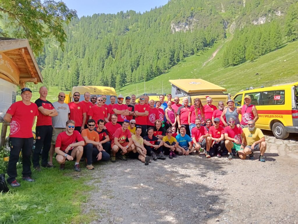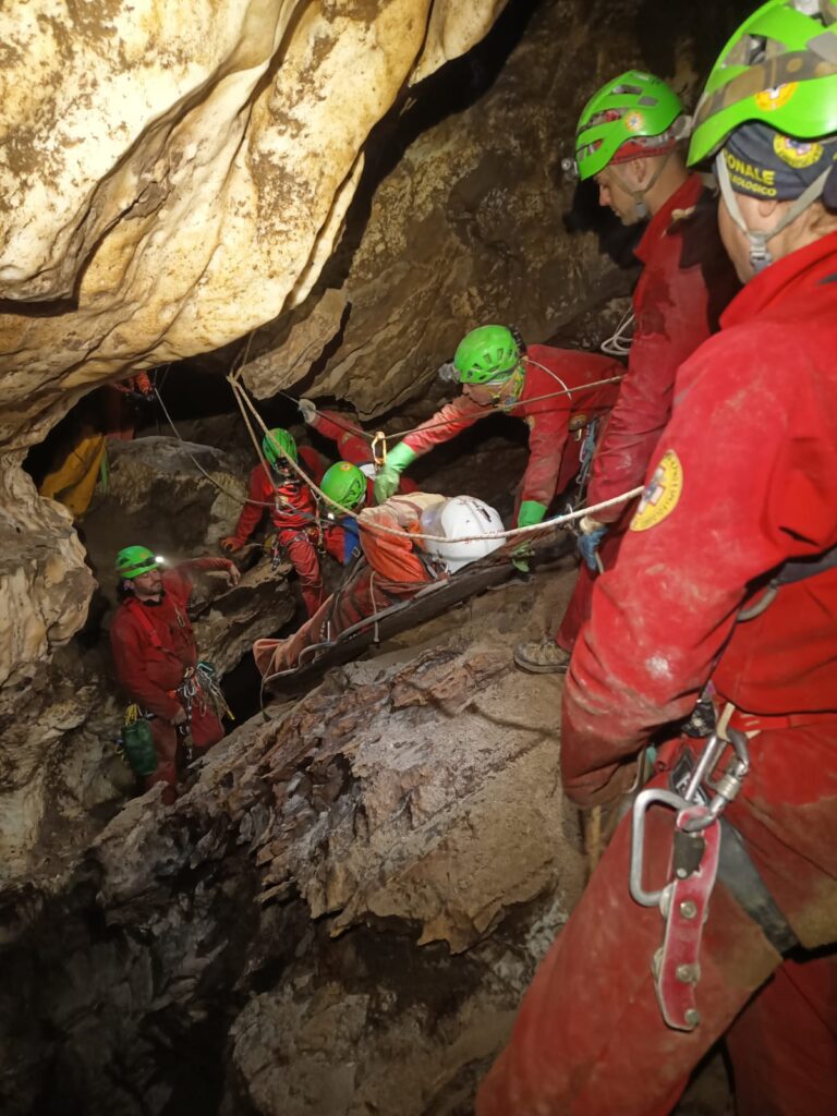 Venerdì mattina i tecnici della prima squadra sono stati elitrasportati insieme ai materiali nei pressi del campo avanzato e tre squadre di telefonisti, ognuna composta da due tecnici, sono entrate in grotta per la posa del doppino telefonico necessario alle comunicazioni tra interno ed esterno grotta, così come succede negli interventi di soccorso reali. Nel pomeriggio di venerdì altri otto tecnici hanno fatto seguito portando sul luogo dell’incidente la barella e il materiale necessario al recupero dell’infortunato. La risalita verso l’esterno della grotta è iniziata attorno alle 16.00 del venerdì pomeriggio e si è protratta fino alla mezzanotte di sabato, per un totale di 32 ore consecutive di operazioni. Quattro squadre di tecnici, per un totale di 50 soccorritori e soccorritrici, si sono alternate in grotta, applicando le tecniche avanzate di movimentazione della barella in un ambiente altamente impegnativo come quello ipogeo che, in questo caso, prevedeva il superamento sia di lunghi meandri sub-orizzontali che di tratti prettamente verticali.