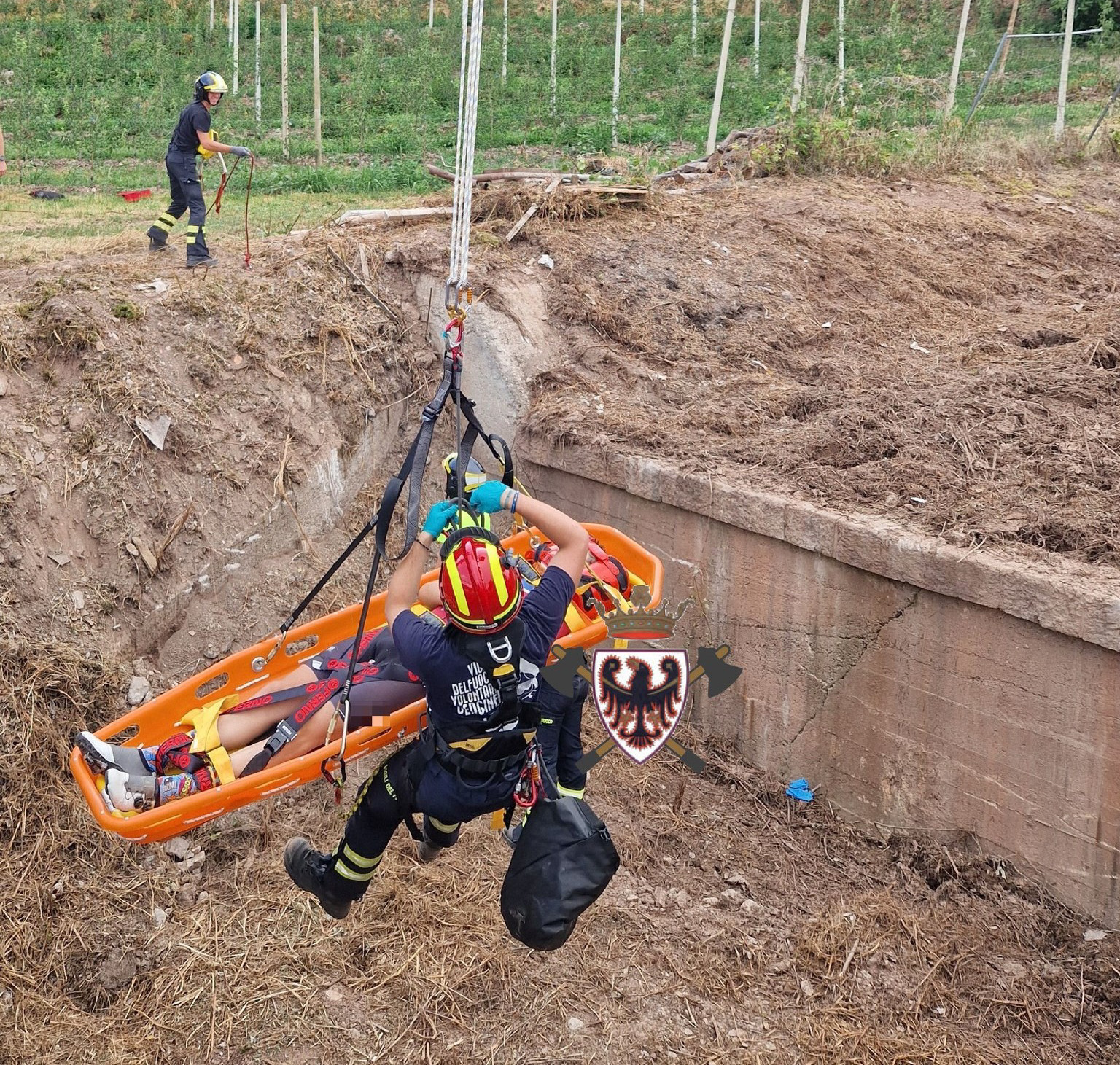 I vigili del fuoco volontari hanno collaborato nelle operazioni di accesso alla scarpata, nel trasporto dei presidi sanitari e quindi nel recupero del ciclista nella barella toboga avvalendosi dell’autoscala.