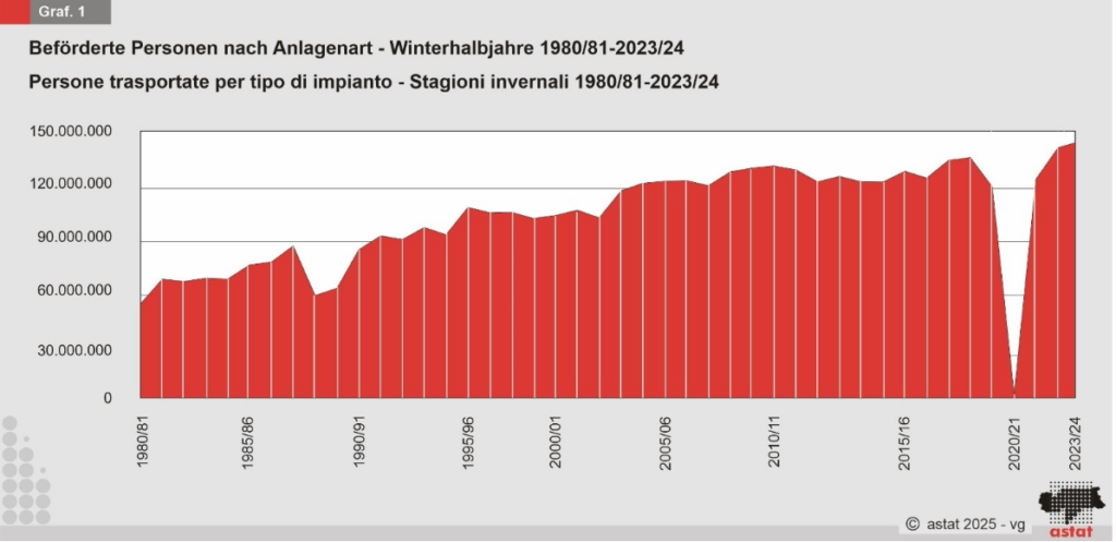 Im Jahr 2023 wurden in Südtirol rund 143,4 Millionen Personen mit Seilbahnen befördert. Dies entspricht einem Plus von 2,6 Prozent gegenüber dem Vorjahr. Die meisten davon nutzten kuppelbare Umlaufbahnen (79,1 Prozent). Gröden-Seiseralm (40 Mio.), Hochabtei (27 Mio.) und das Pustertal (22 Mio.) lagen bei den Fahrgastzahlen vorne. Im Schnalstal ging die Zahl der Fahrgäste um 20 Prozent zurück. Dies liegt aber an dem Neubau der Pendelbahn Kurzras–Grawand.