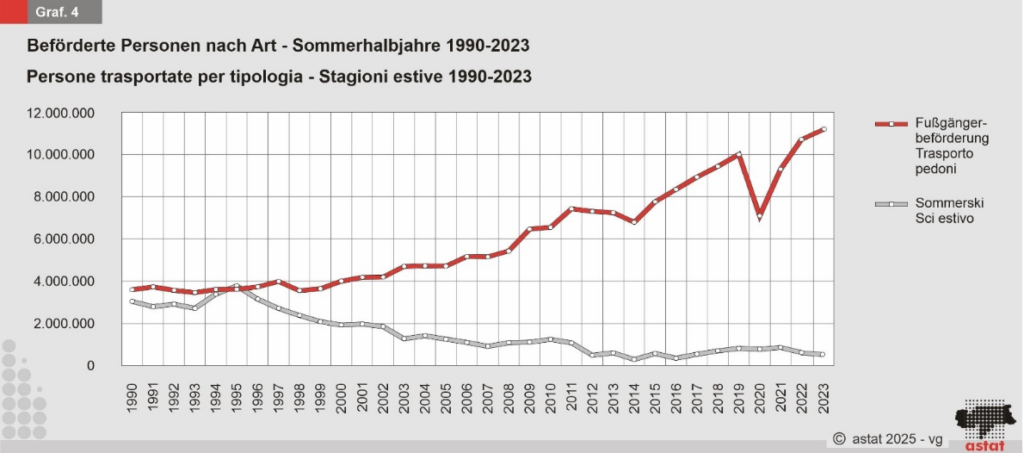 Im Sommerhalbjahr 2023 wurden 10,9 Millionen Wanderer und Pender mit Seilbahnen befördert. Das sind fast dreimal so viele wie im Jahr 2000. Der Sommerskilauf hingegen verliert weiter an Bedeutung. Nach der Schließung der Anlagen auf dem Schnalstaler Gletscher bleibt nur noch das Stilfserjoch, das 2023 ebenfalls vorzeitig den Betrieb einstellte.