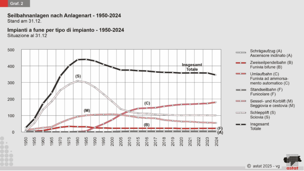 Zum 31. Dezember 2024 gab es in Südtirol 354 Seilbahnanlagen, drei weniger als im Vorjahr. Es wurden sechs neue Anlagen errichtet, neun abgebaut, 16 generalüberholt und sieben wesentlich umgebaut. Immer mehr fixgeklemmte Bahnen werden durch moderne, kuppelbare Anlagen ersetzt, die nun 49,7 Prozent aller Anlagen ausmachen. Die Zahl der Schlepplifte ist von 310 im Jahr 1980 auf 98 im Jahr 2024 zurückgegangen.